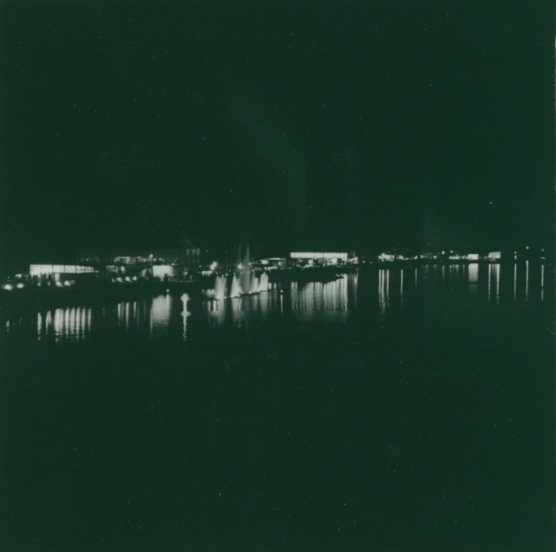 Bilden föreställer översikt över hela parapeten i belysning. I förgrunden hamnbassängen, med fontän. Bilden tagen när det är mörkt.