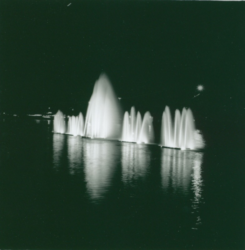 Bilden föreställer en belyst fontän i fem sektioner i norra hamnen. Helt mörk bakgrund.