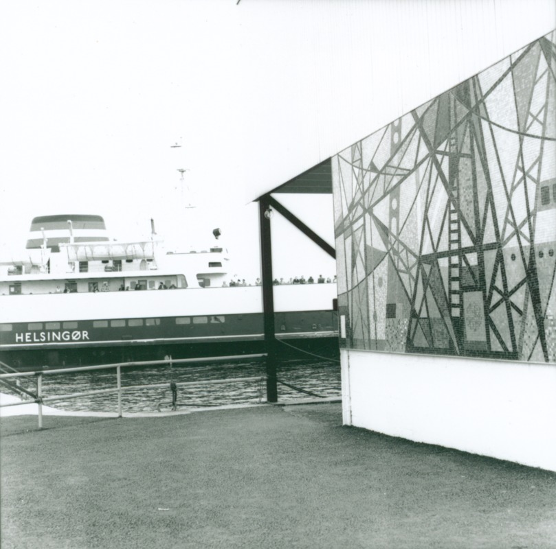 Bilden föreställer i bakgrunden en färja med namn Helsingör. I förgrunden gångstråk och en fasad med ett konstverk iform av geometriska figurer.