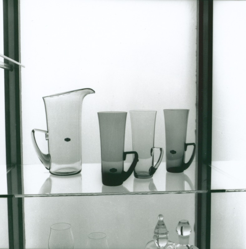 Bilden föreställer en glashylla med fyra kannor i glas.