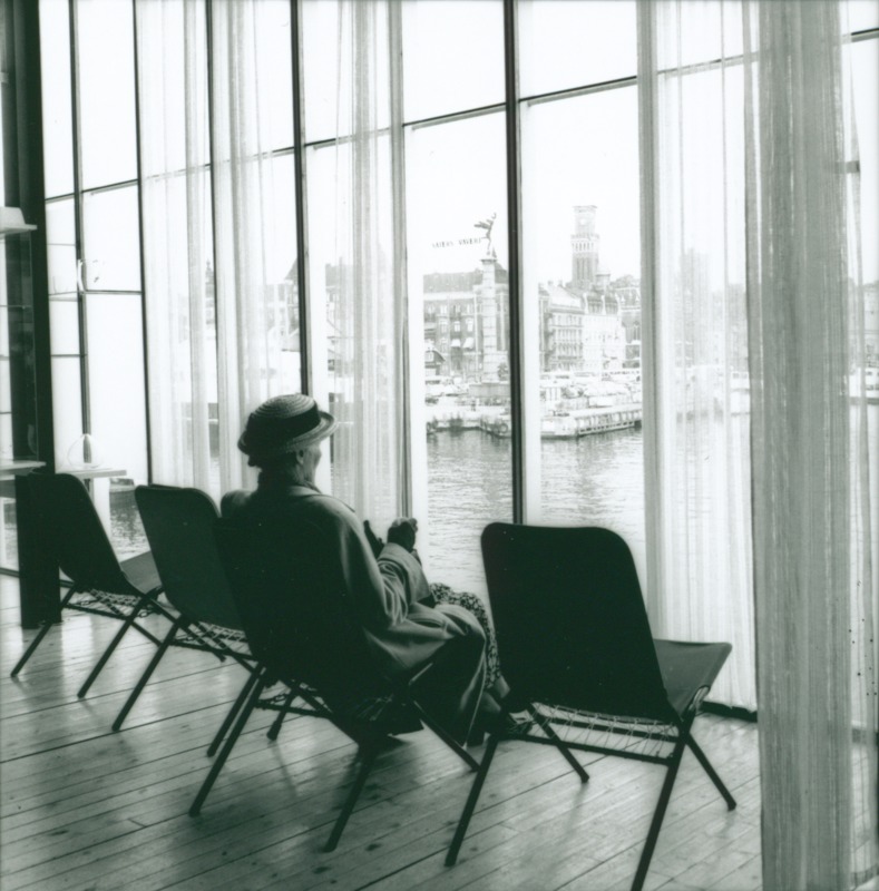 Bilden föreställer interiören i en utställningspaviljong. Framför en glasfasad står det stolar och i en av dem sitter en kvinna. Utsikt mot hamnen.