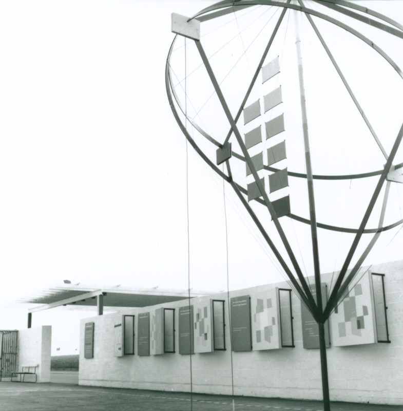 Bilden föreställer i förgrunden skulptur med metallringar och rektanglar sammanfogade. Där bakom en vägg med planscher med bilder och text.