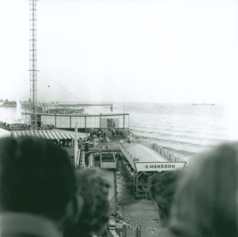 Bilden föreställer utsikt över parapeten med olika paviljonger. En paviljong har skylten G. Månsson. I bakgrunden hav med fartyg. I förgrunden människohuvuden.