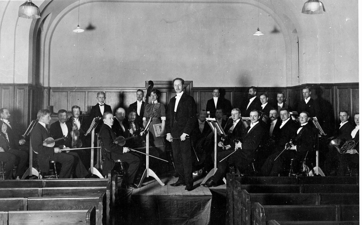 Borås orkesterförenings konsert i läroverkets aula 6/4 1913. Dirigent V E Lundqvist. Solist Ingegerd Blomgren.