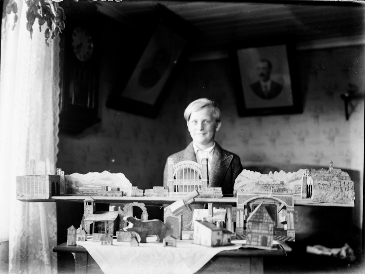 En pojke bakom bord i finrummet med figurer han har tillverkat, troligen i papp. Kan ha varit bilagor i tidningar eller beställda från hobbykataloger. En tågbana med station och tunnel under en by, ett korsvirkehus, en flodhäst, en teater med mera. I interiören syns spetsgardin, hängkaktus, porträtt och pendelur.