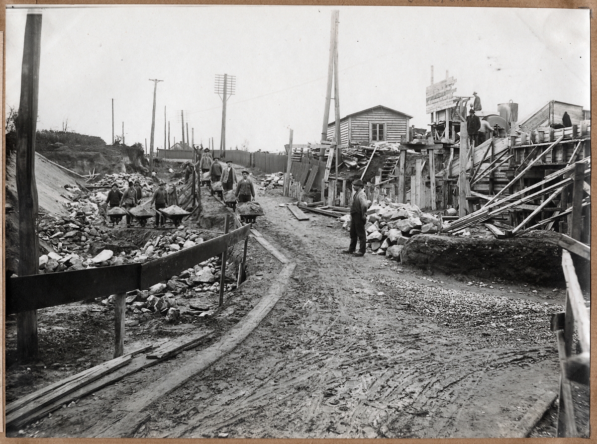 Sänkning av tillfartsvägarna till vägporten i Tredje Avenyen, Hässleholm. Oktober 1917.