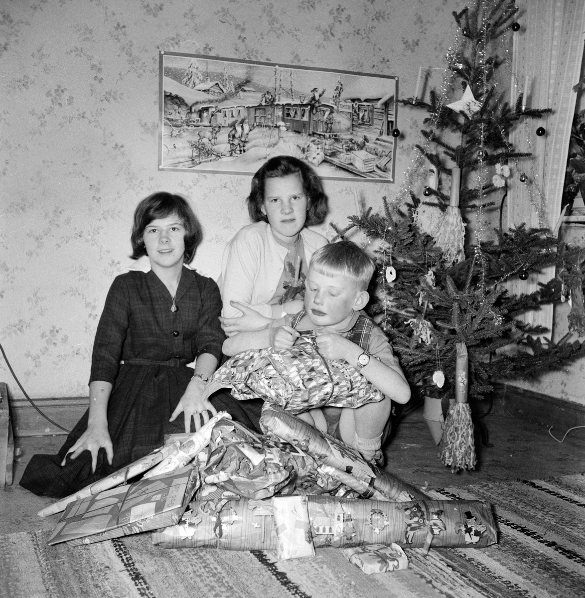 Julafton hos Toms farmor. Barnen som väntar vid julklappshögen är från vänster: Lillemor Johansson (1), Margareta Johansson (2) och Tom Andersson (3).