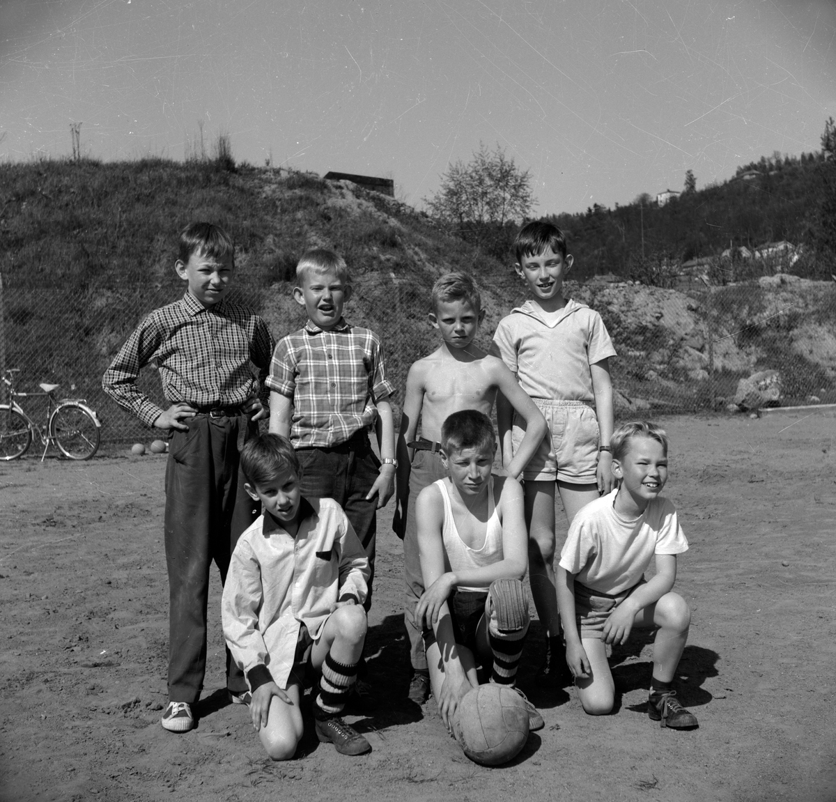 På "Maden" i Huskvarna är några pojkar uppställda med fotbollen framför sig. Stående från vänster: Göran Landin (1), Tom Andersson (2), Kenneth Waldsjö (3), Per Nordmalm (4) Sittande: Wikborg (1), Stig Elv (2), Lars Nordmalm (3).