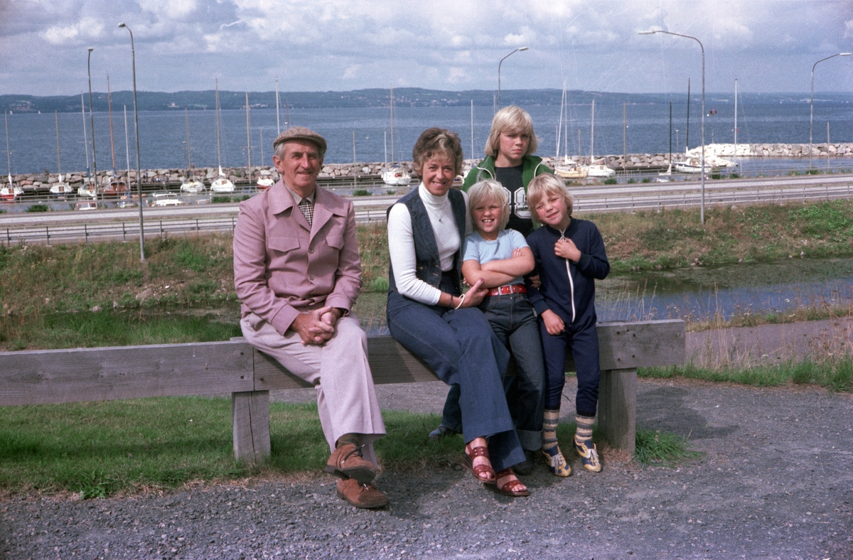 Vid Kroatorpets parkering på Grännavägen i Huskvarna sitter en äldre man och familjen Waern. Från vänster: Ingrid Waern (2) med barnen Agneta (3), Anneli (4) och Jonas (5).