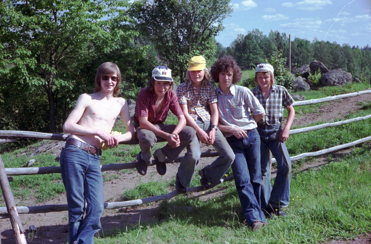 Vid en gärdesgård i Kikstorp i Hakarp, Huskvarna, står fem ynglingar. Från vänster: Bo Gustavsson (1), Mikael Bernström (2), Peter Gustavsson (3), Göran Bernström (4) och Karl-Göran Gustavsson.