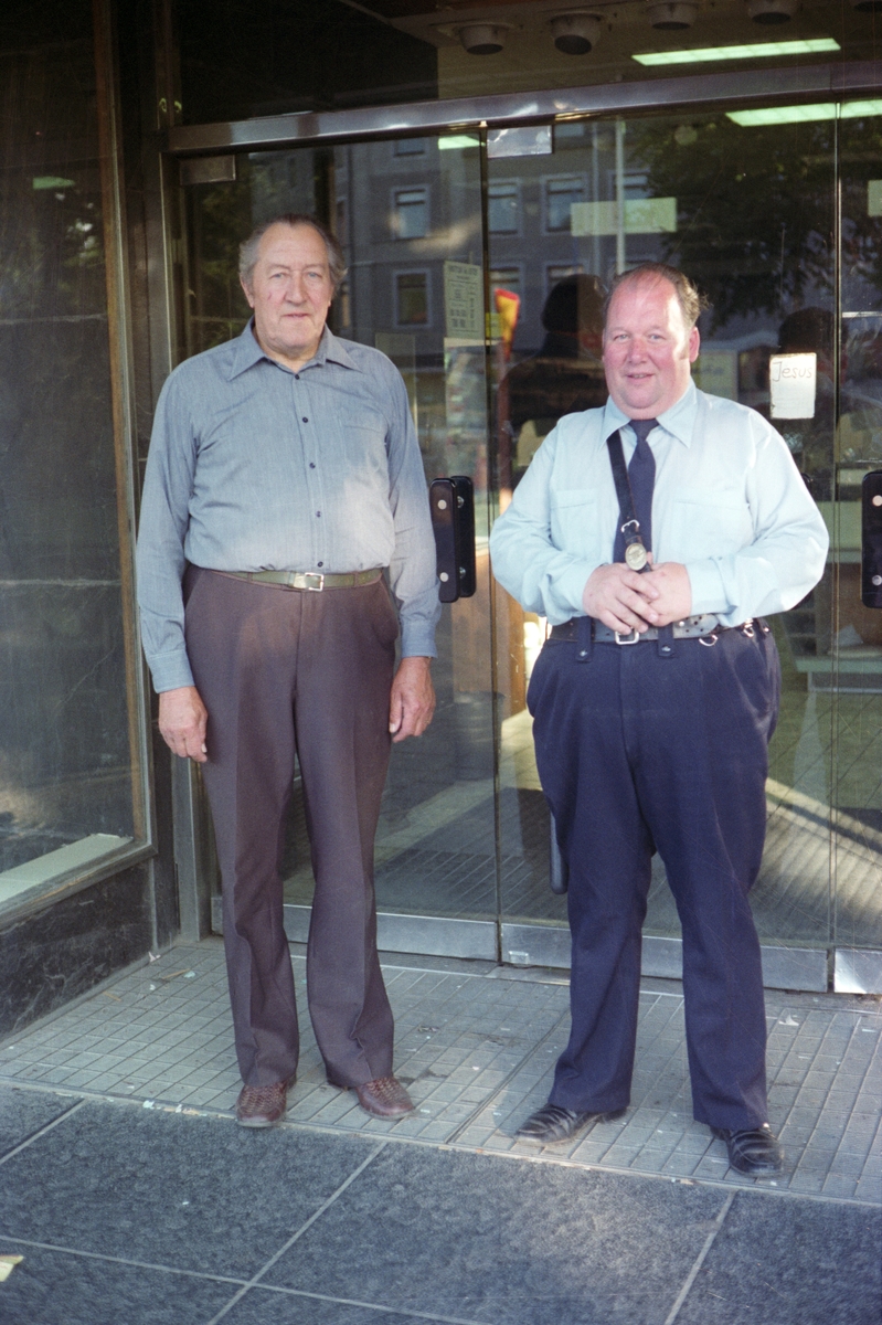 Till höger står "Cannon" Forsberg, som vakt vid Rosengallerian i Huskvarna.