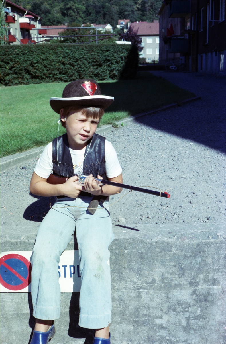 En pojke utklädd till cowboy med leksaksgevär i handen sitter utanför Börefelts Livs i Huskvarna.