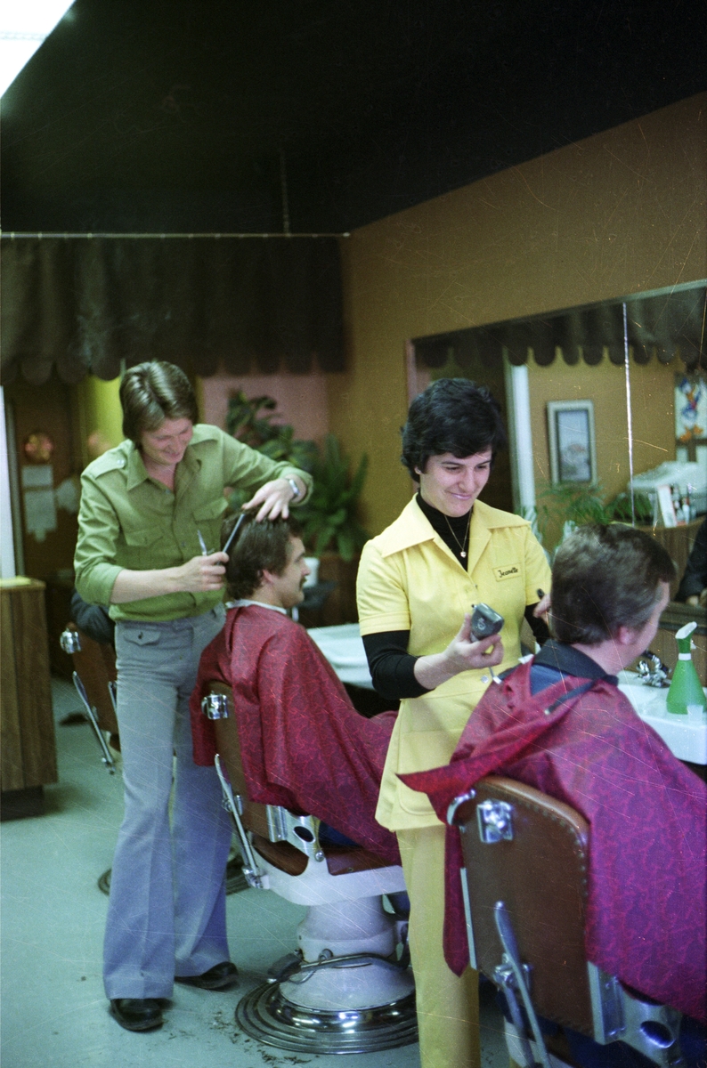 I en frisersalong på Kungsgatan 23 i Rosenhuset i Huskvarna arbetar Gunnar Andersson och Jeanette Ljung med klippning av två kunder.