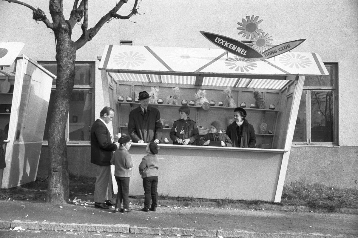 Familjen Svensson säljer lotter i ståndet "Lyxkennel" på Elverksplan i Huskvarna i samband med Lions loppmarknad.