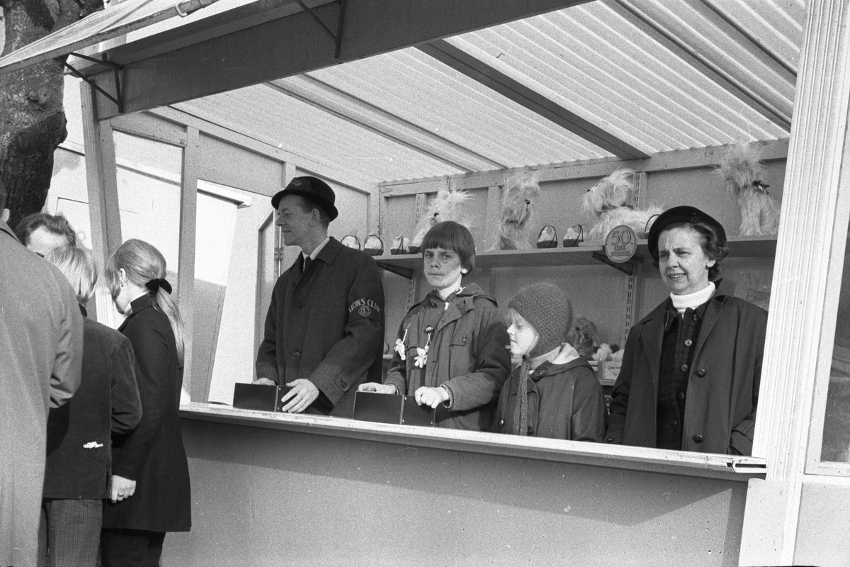 Familjen Svensson säljer lotter i ståndet "Lyxkennel" på Elverksplan i Huskvarna i samband med Lions loppmarknad.