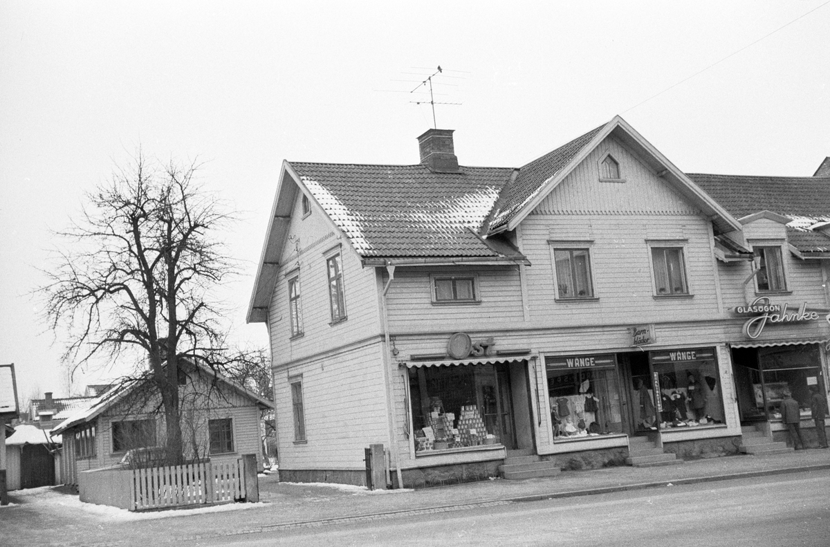 Hus vid Rosenborgsgatan i Huskvarna. En Ost-affär, Wrange barnkläder och Glasögon Jahnke finns i markplan med bostäder på ovanvåningen.