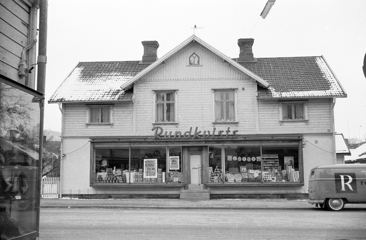 Hus vid Rosenborgsgatan i Huskvarna. Rundkvists speceriaffär finns i markplan och bostäder på ovanvåningen.