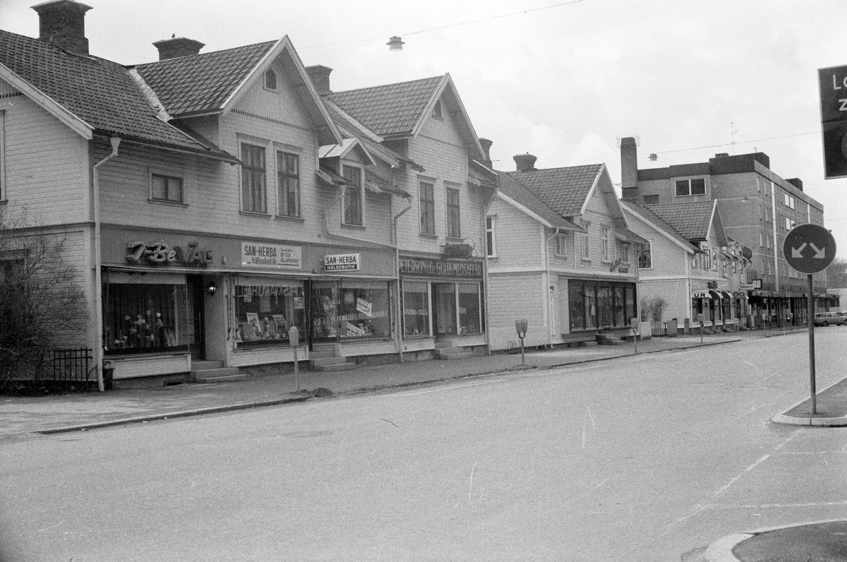 Hus vid Rosenborgsgatan i Huskvarna. Affärer finns i markplan och bostäder på ovanvåningen.