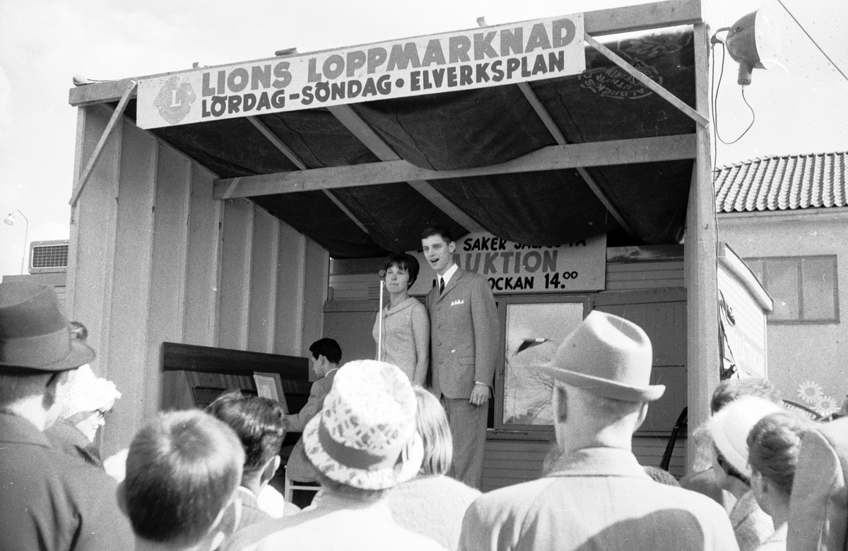Lions, en ideell internationell välgörenhetsorganisation, har loppmarknad på Elverksplan i Huskvarna. På en liten scen uppträder Ellen Pelmas och Hans Josefsson, vid pianot sitter Arne Siwerth.