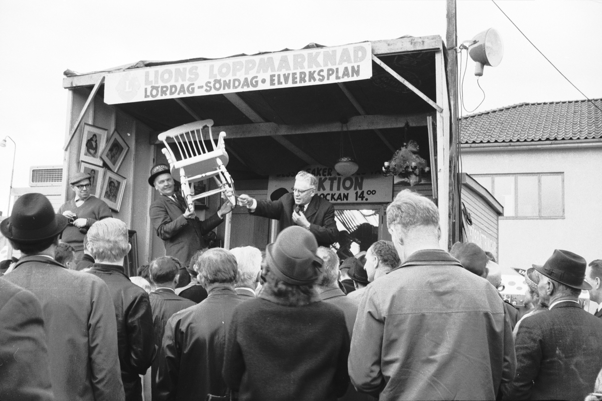 Lions, en ideell internationell välgörenhetsorganisation, har loppmarknad på Elverksplan i Huskvarna. På en liten scen är det auktion av en del föremål, här hålls en gungstol upp.