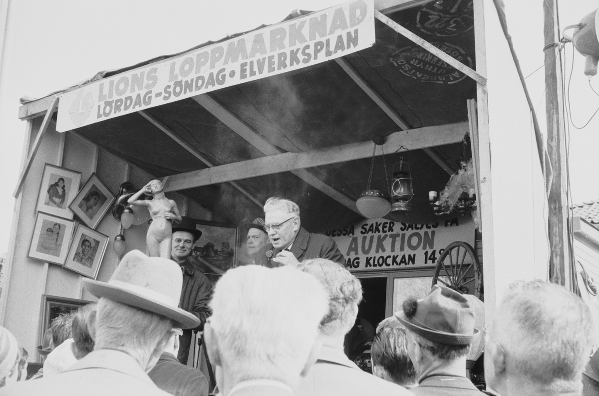 Lions, en ideell internationell välgörenhetsorganisation, har loppmarknad på Elverksplan i Huskvarna. På en liten scen är det auktion av en del föremål, här hålls en staty av en kvinna upp.