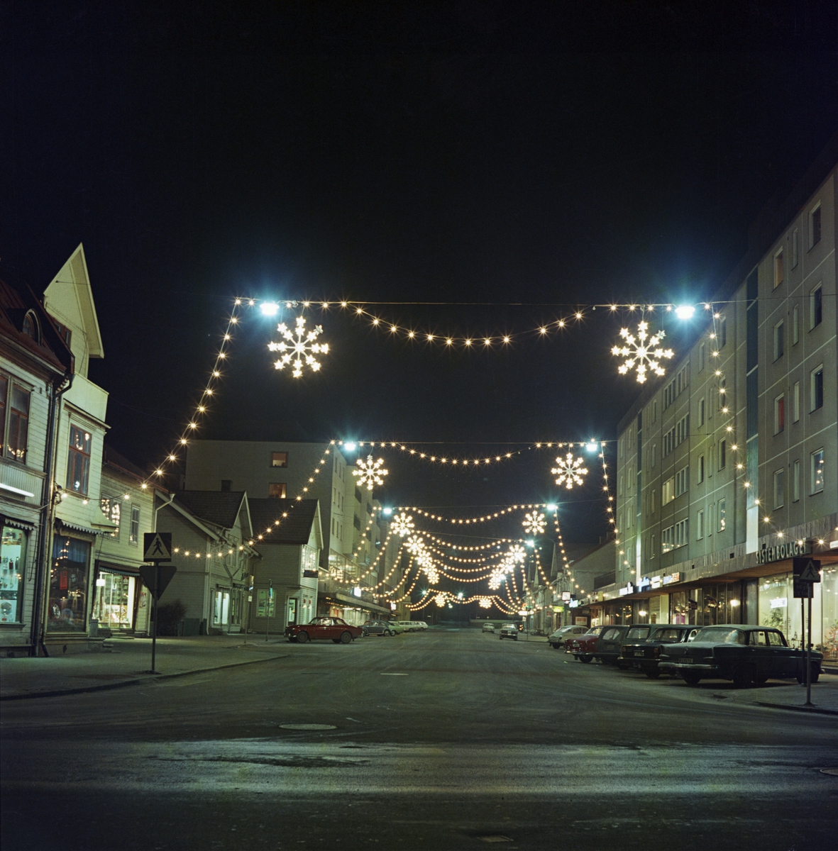 Diverse butiker utmed Rosenborgsgatan i Huskvarna där julbelysningen är uppsatt.