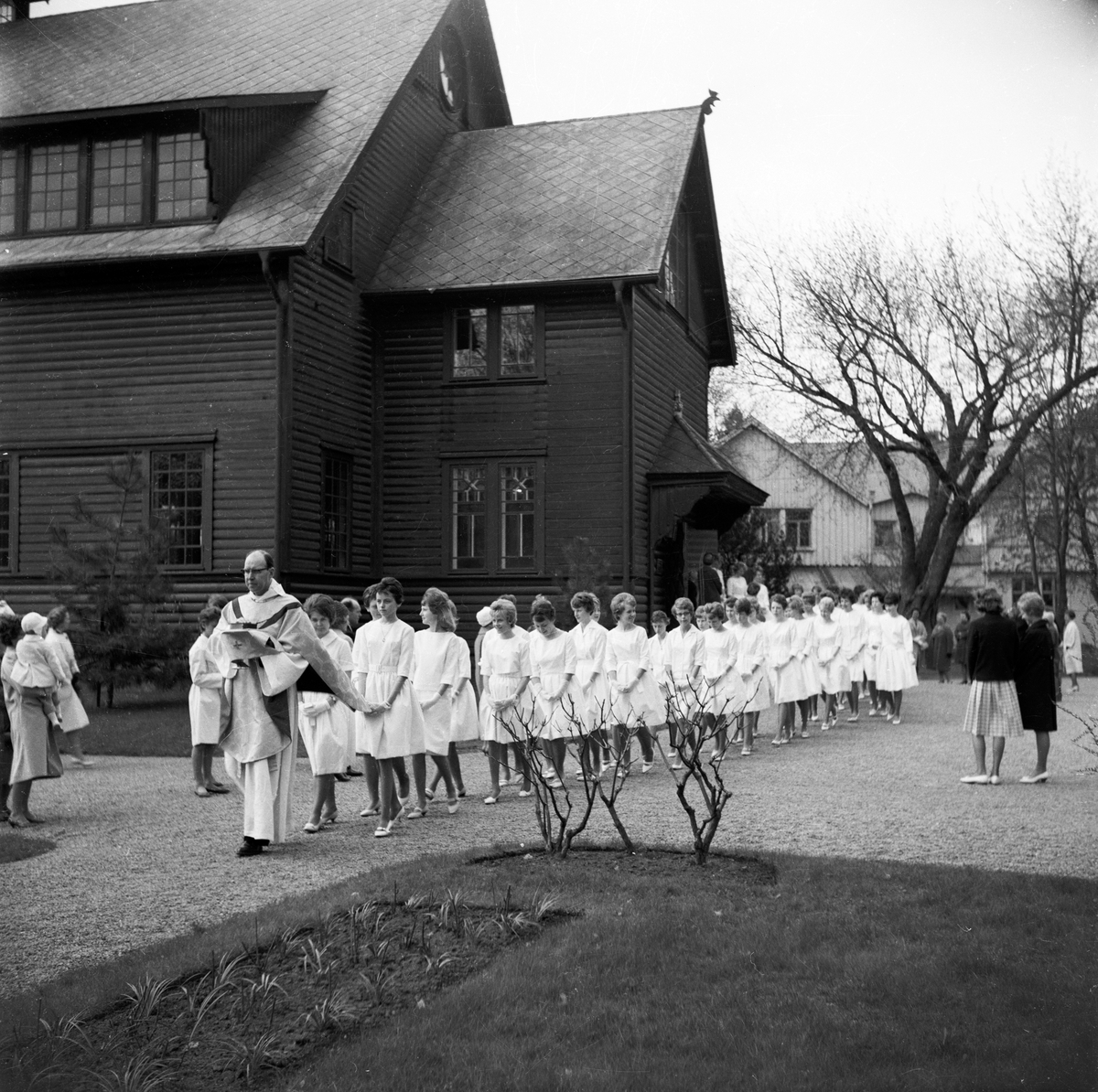 Konfirmation i Huskvarna kyrka. Flickorna är klädda i vita knälånga klänningar, vita skor och vita vantar.