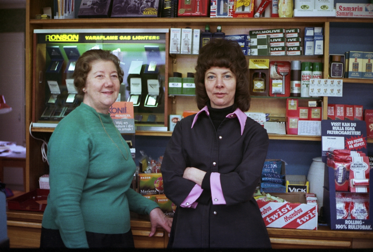 I Gustavssons Tobak, på Rosenborgsgatan i Huskvarna, står från vänster Margit Gustavsson (1) och Barbro Malm (2).