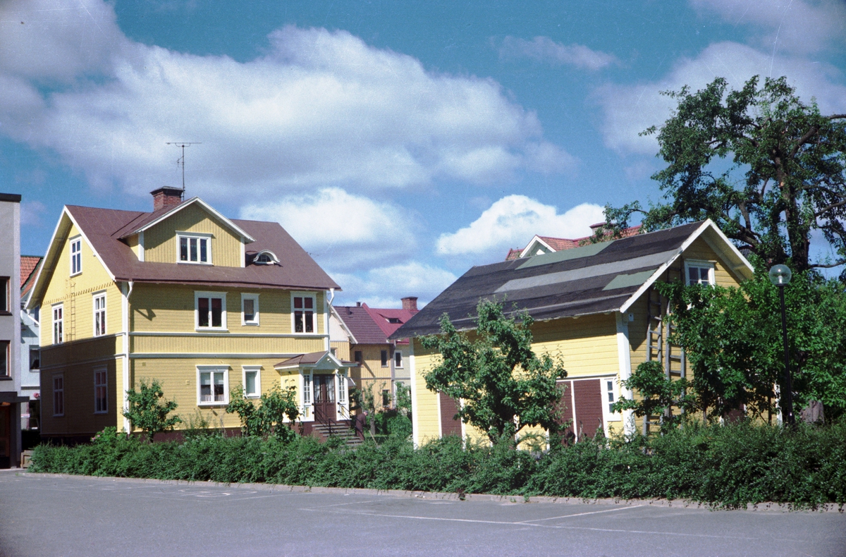 Titel: En gul trävilla på Linnégatan i Huskvarna. Mitt emot ligger Gisebo-affären och till vänster Handelsbanken.