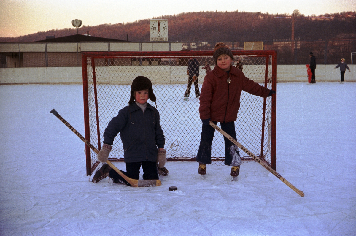 På Vapenvallen i Huskvarna är skridskobanan frusen och två pojkar spelar ishockey. Till vänster i målet är Jan Svensson (Bylund) (1).