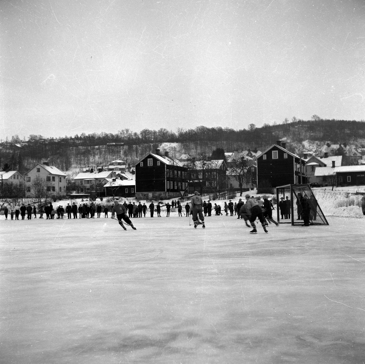 Några män spelar bandy på Zinkens damm i Huskvarna och åskådarna står utmed kanten.