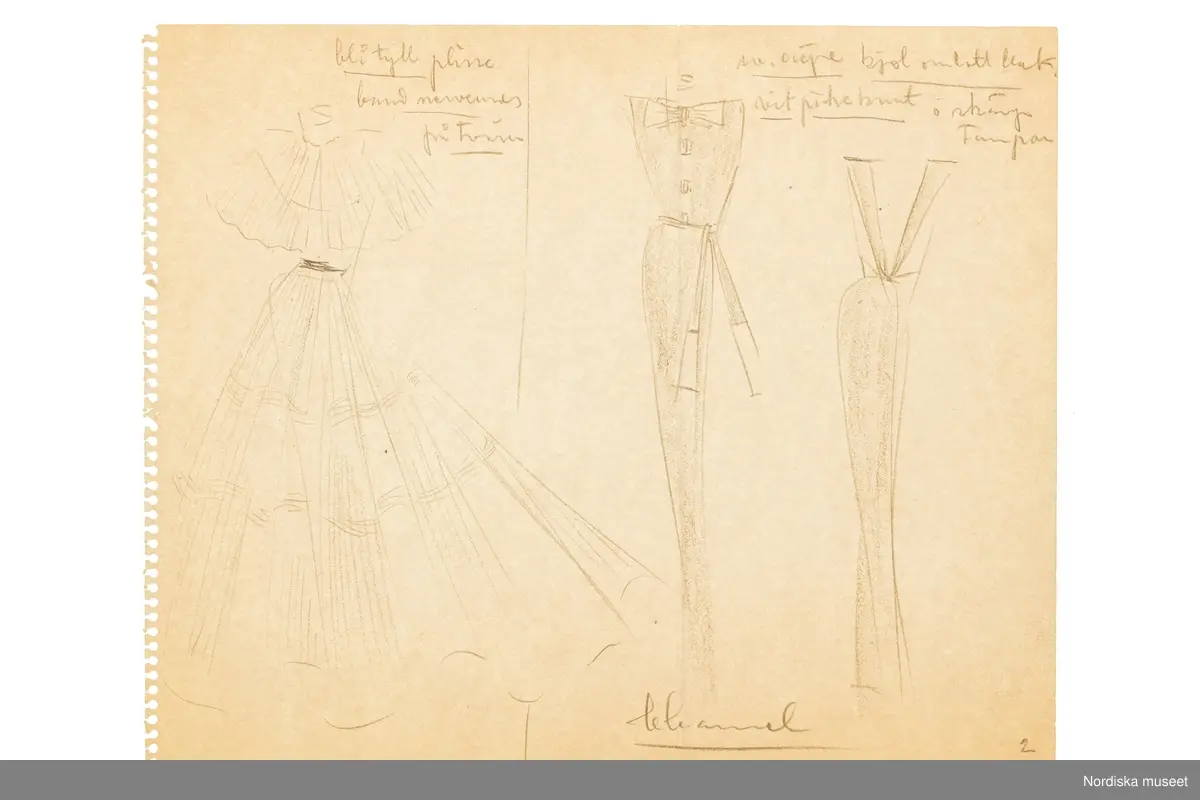 Modeskisser utförda av Pelle Lundgren (1896-1974) kreatör, från 1923 förste försäljare och senare ateljéchef på NK:s Franska damskrädderi. Från 1965 till stängningen av verksamheten 1966 var han disponent. Pelle Lundgrens minnesskisser från de kända modehusen i Paris är tecknade efter visningarna, i ritblocket eller på det som fanns till hands – som hotellets brevpapper. De snabba skisserna inspirerade ateljéns egna modeller. Här ses teckningar utförda våren 1939 med plagg från exempelvis Chanel, Schiaparelli, Paquin, Piquet, Rouff och de Rauch.
