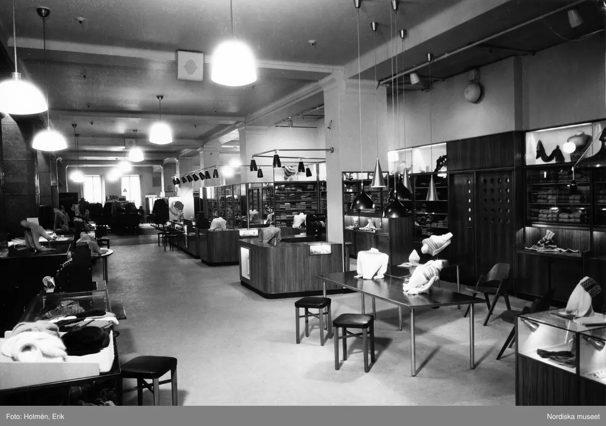 Interiör från Nordiska Kompaniet. Vinterkläder på skyltdockor och diskar.