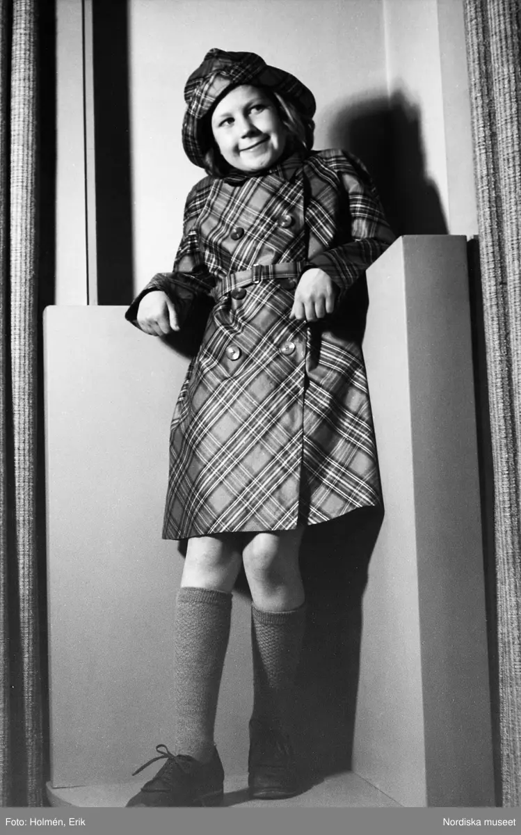 Flicka i rutig, dubbelknäppt kappa med skärp, mössa, knästrumpor och snörskor.