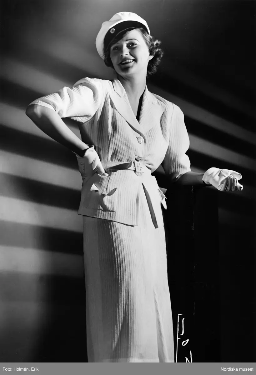Modell i vit jacka och kjol, vita skinnhandskar och studentmössa.