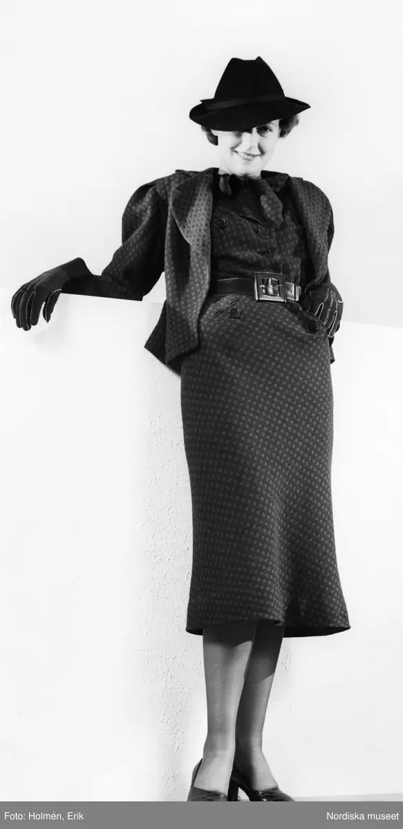 Modell i prickig klänning och tillhörande jacka, filthatt, handskar och pumps. Modellen lutar sig mot rekvisita.