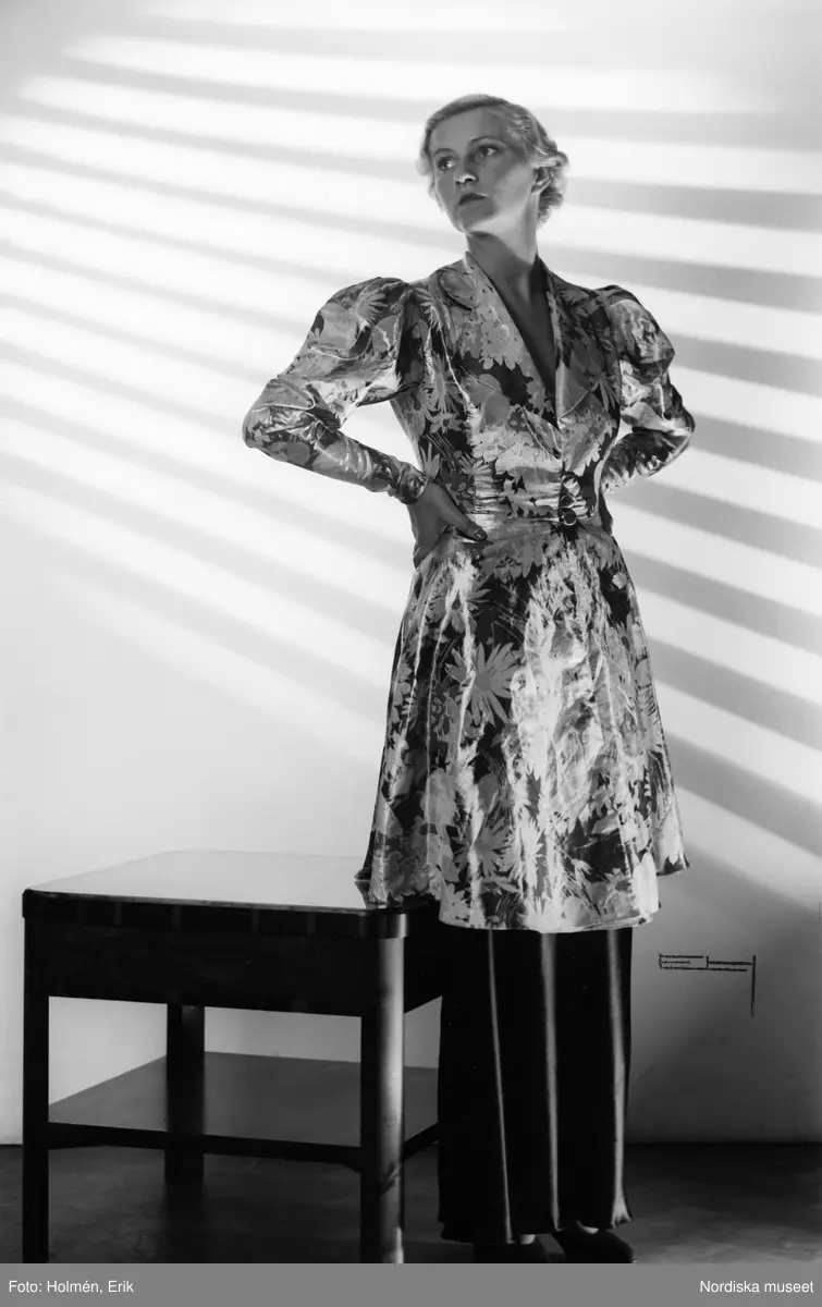 Modell i storblommig klänning med pösärm och svart kjol undertill. Tidningsbord i bakgrunden.