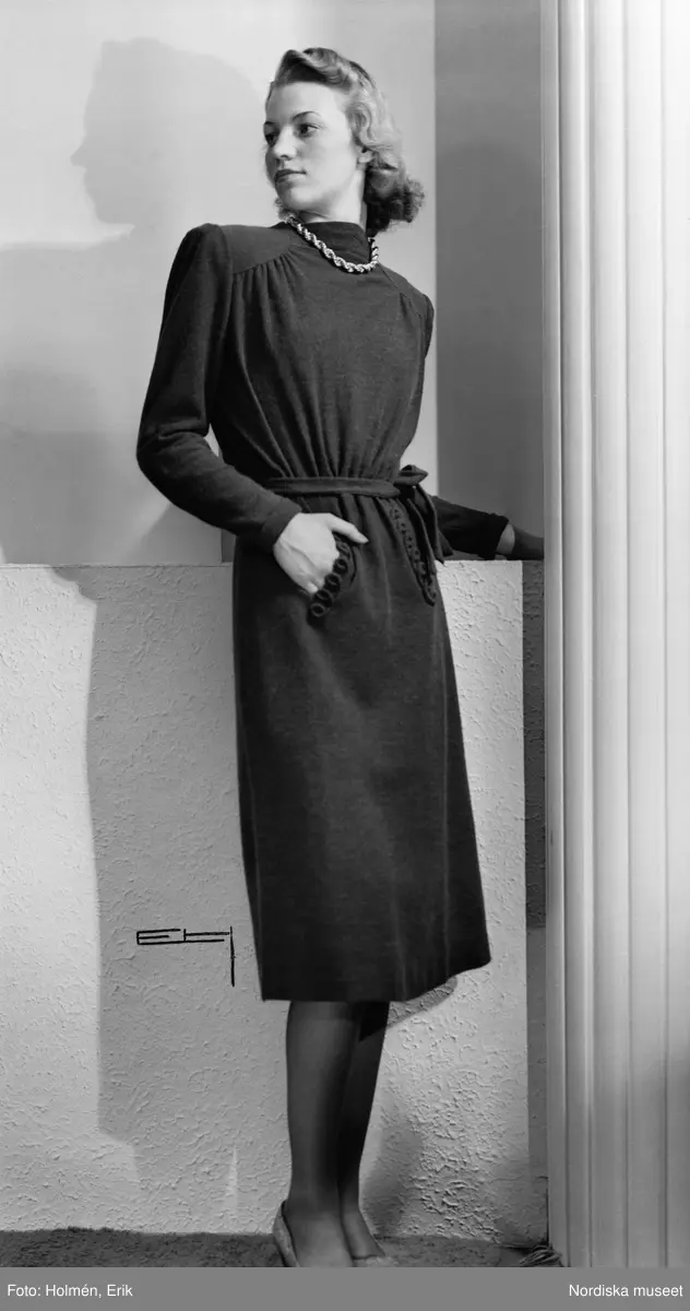 Modell i knälång klänning med skärp och pumps. Silverhalsband.