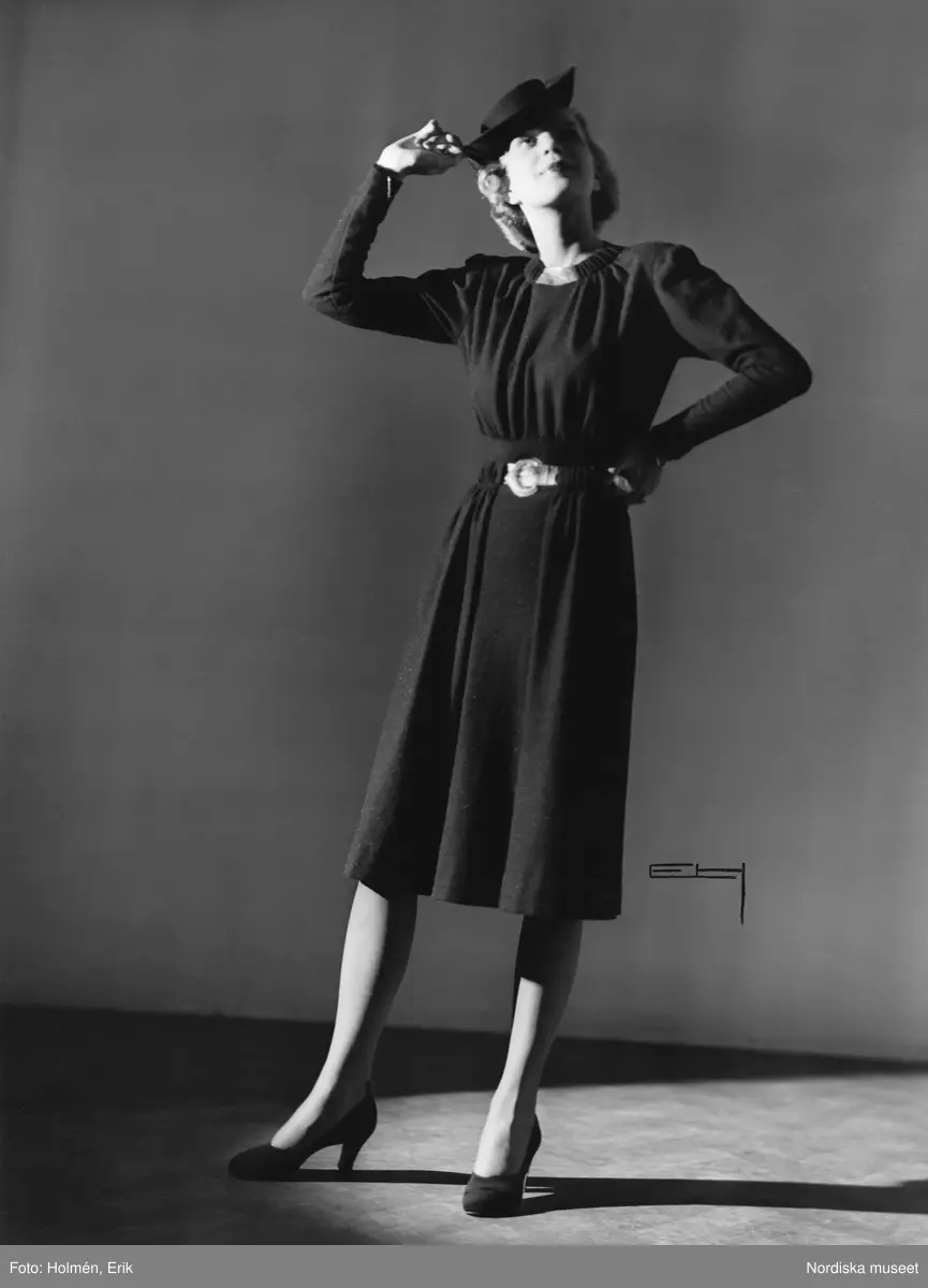 Modell i mörk klänning med skärp och halsringning i metallic. Filthatt och pumps.