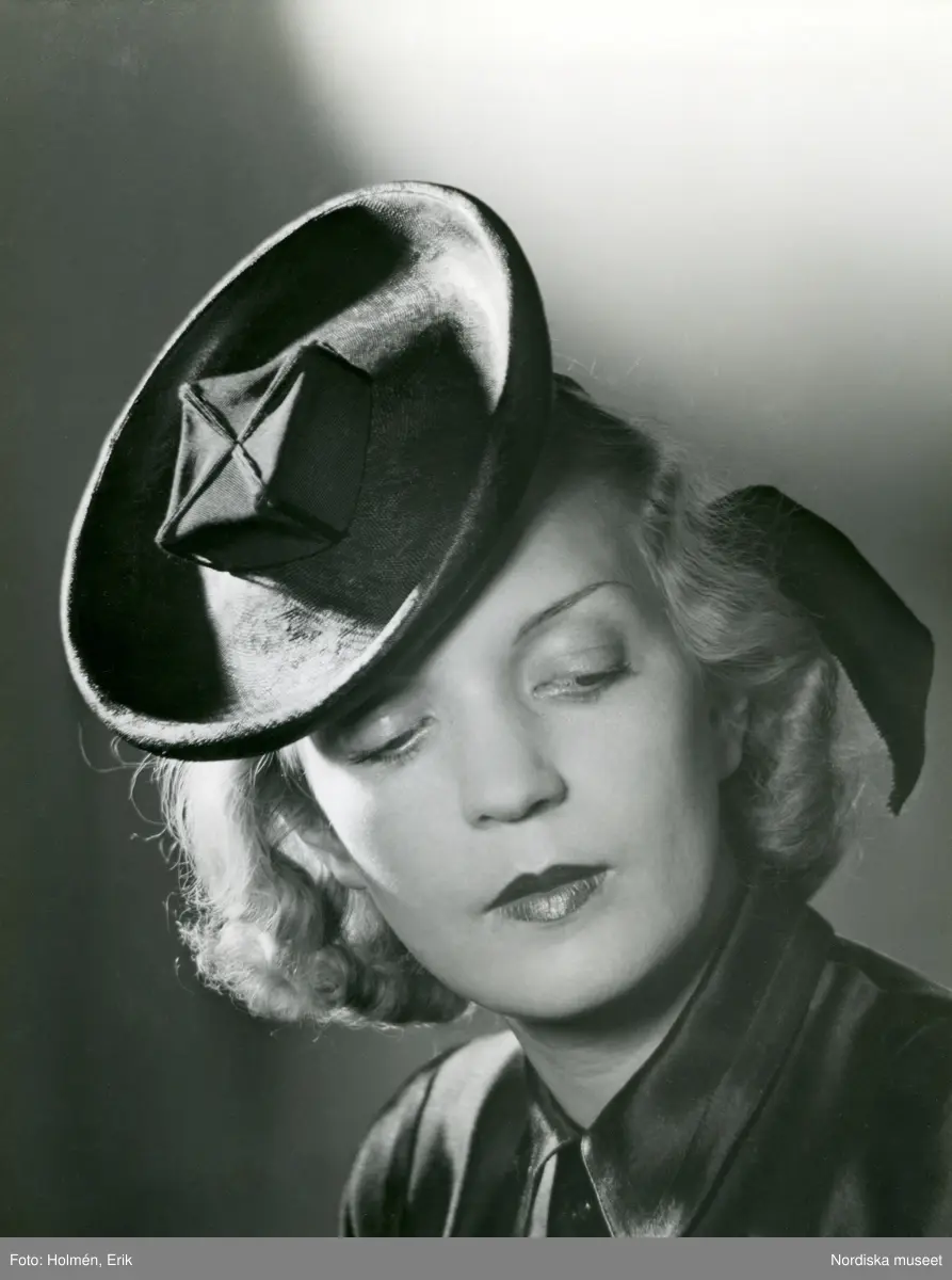 Porträtt av kvinna i hatt med fyrkantig kulle.