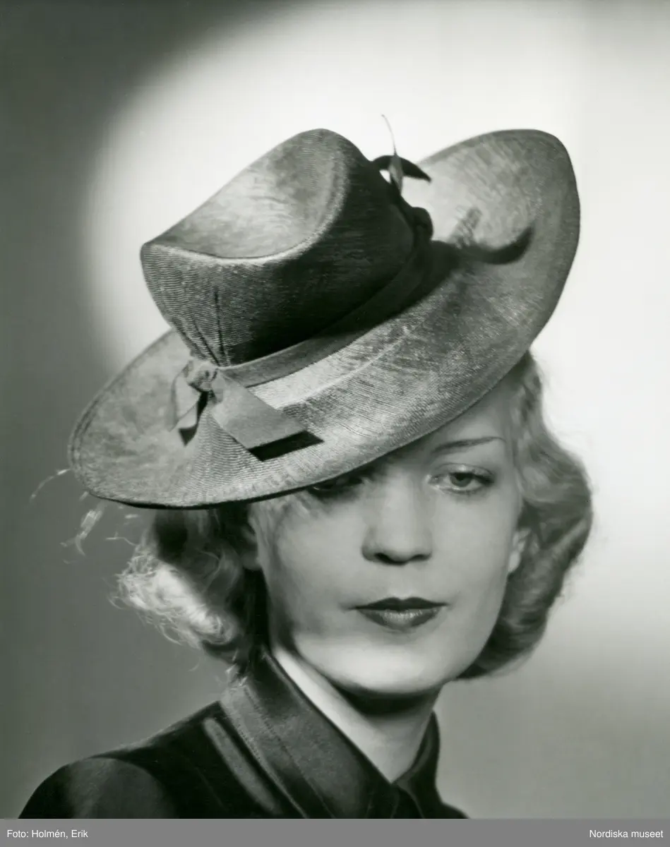 Porträtt av kvinna i mörk blus och hatt med smalt band.