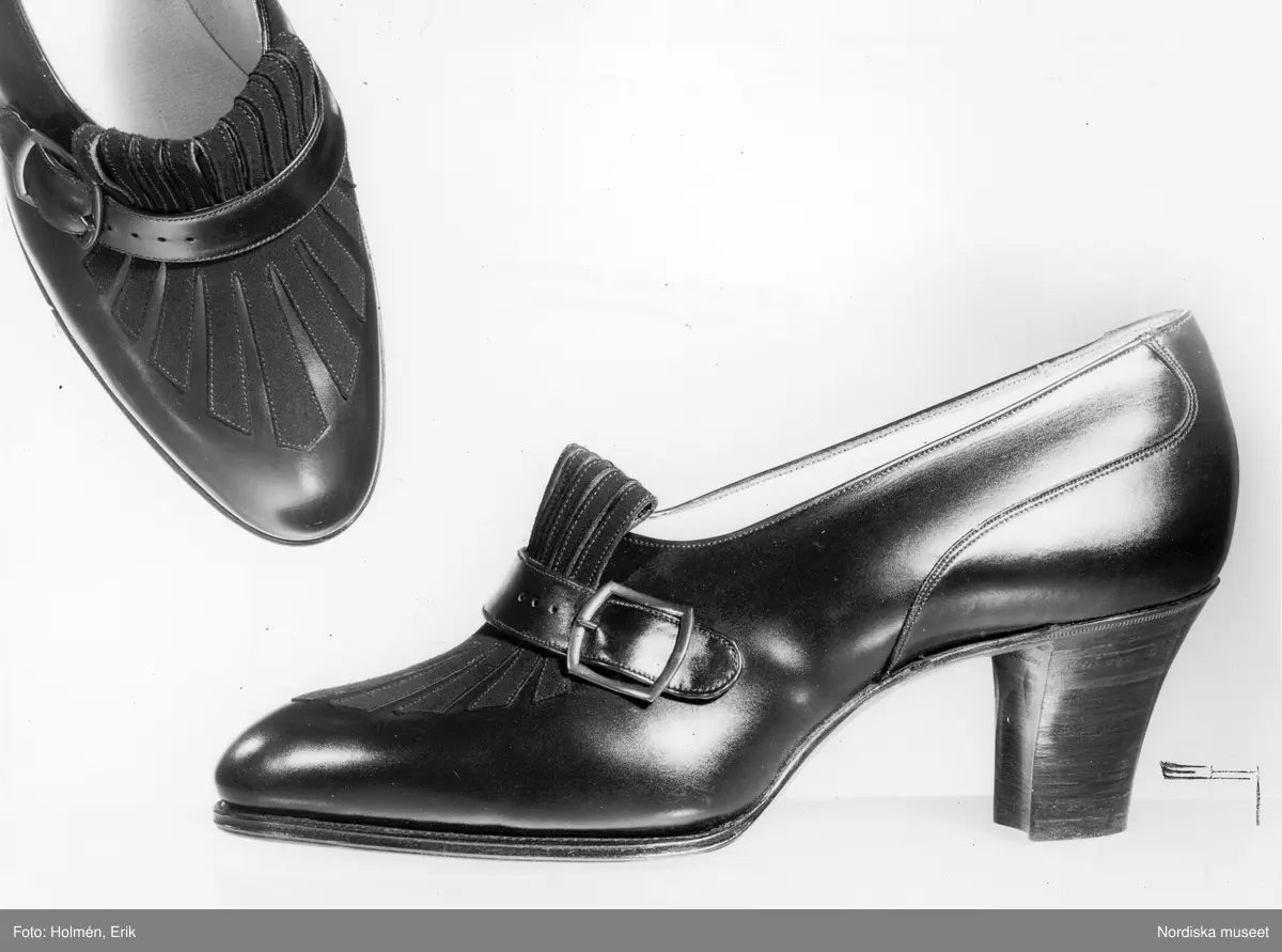 Promenadpumps av brun eller svart boxkalv med garnering av svart mocca.