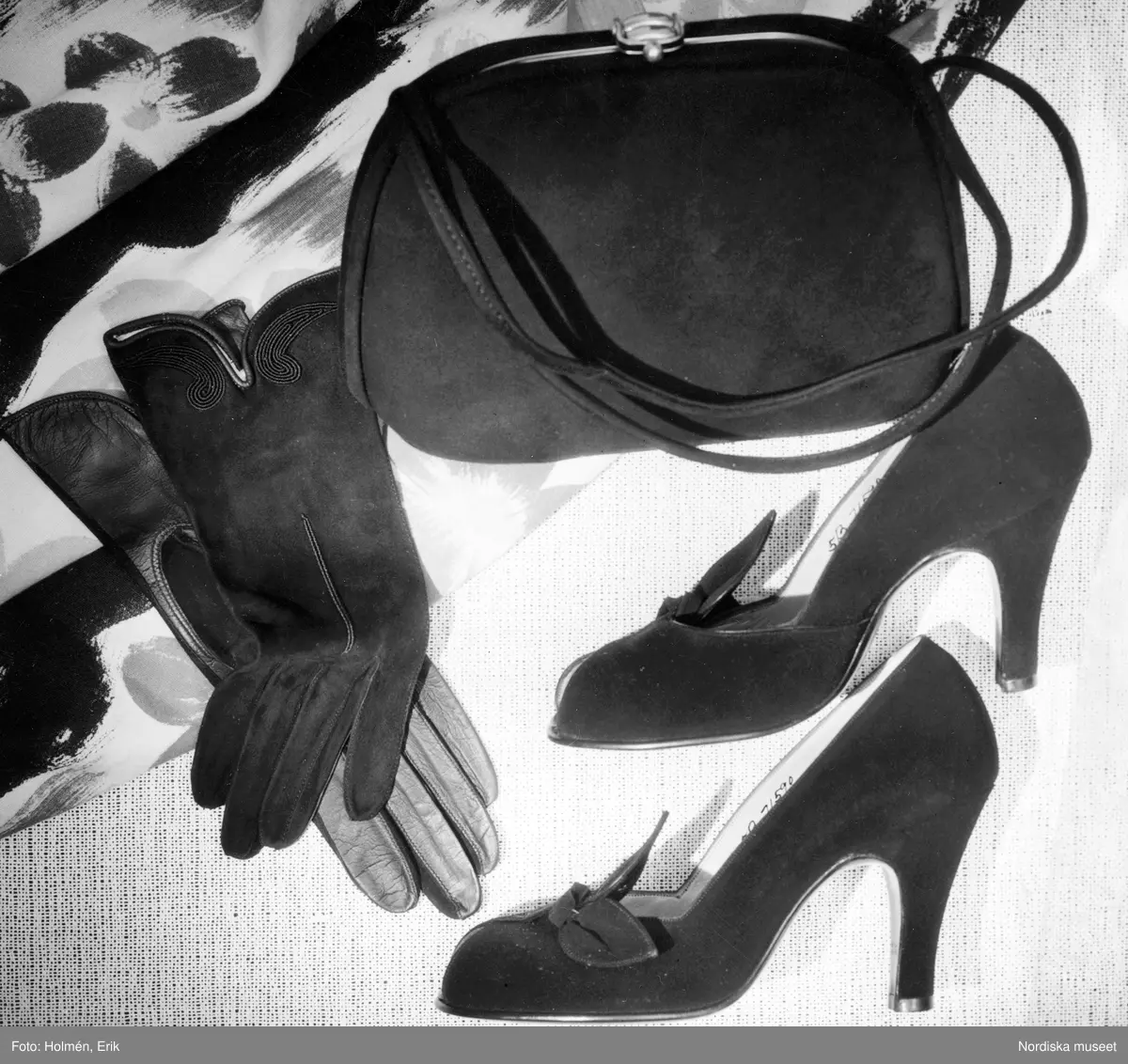 Skoutställning, Vår. Pumps, handväska, handskar mönstrad textil.