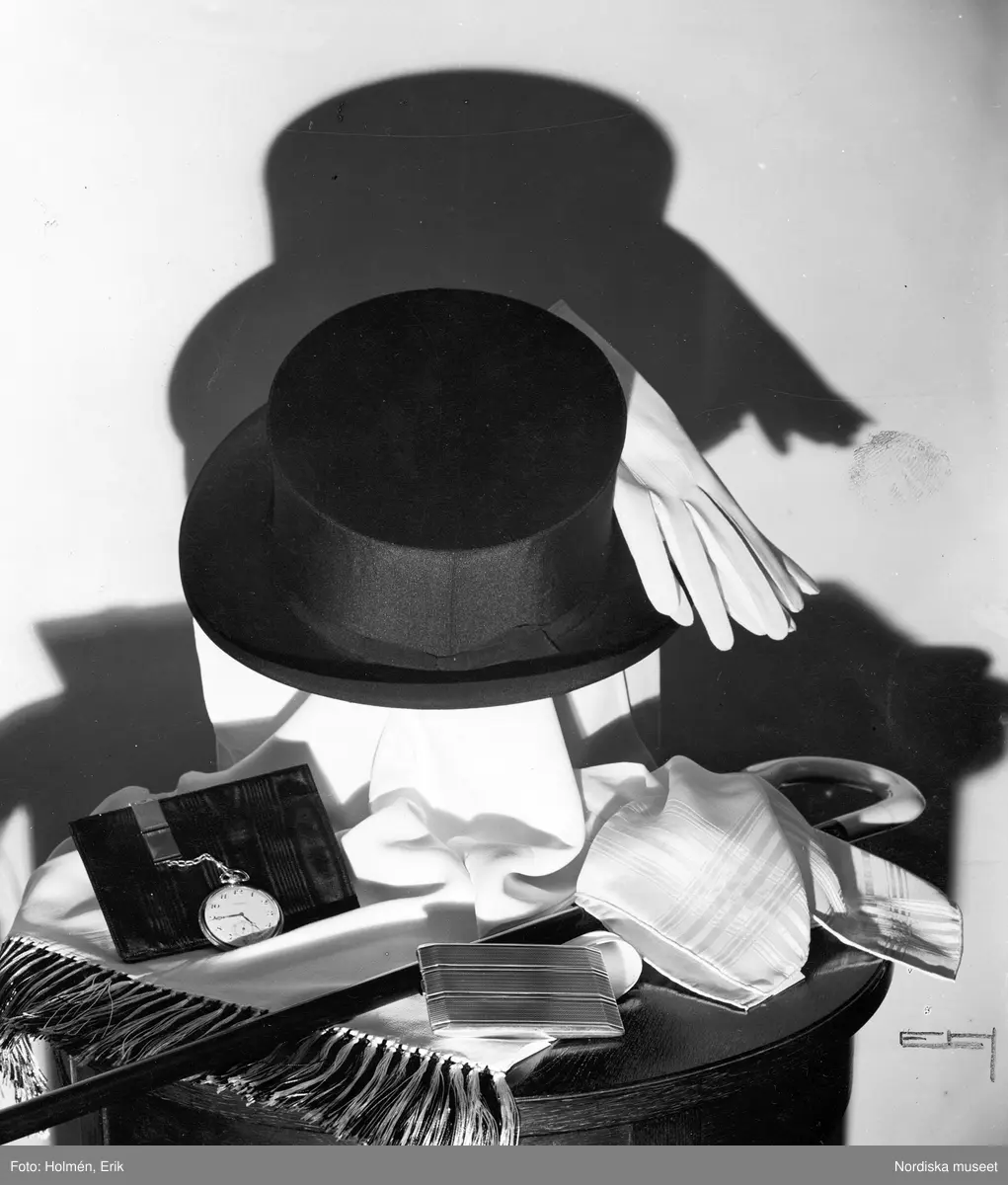 Herr-accessoarer. Hatt, handskar, klocka, käpp, halsduk och cigarettetui.