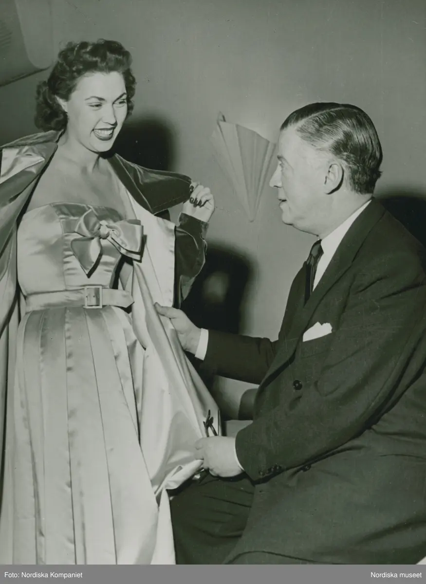 Modell i sidenklänning och kappa. Disponent Kurt Jacobsson NK:s franska i kostym.