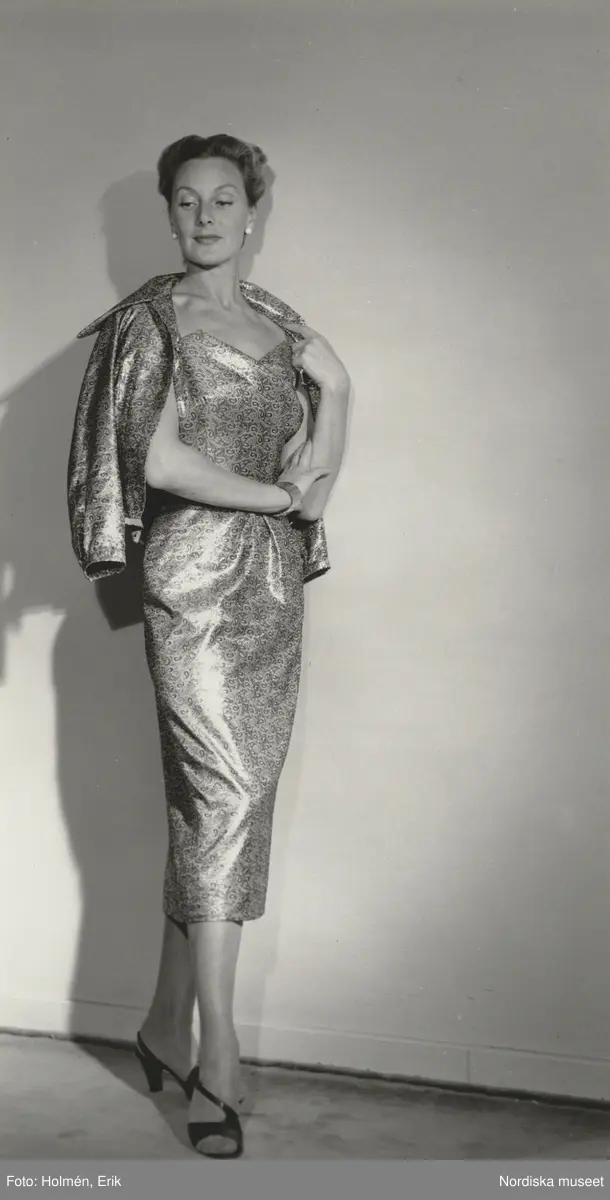 Modell i paisley-mönstrad klänning och jacka. Från NK:s Franska.