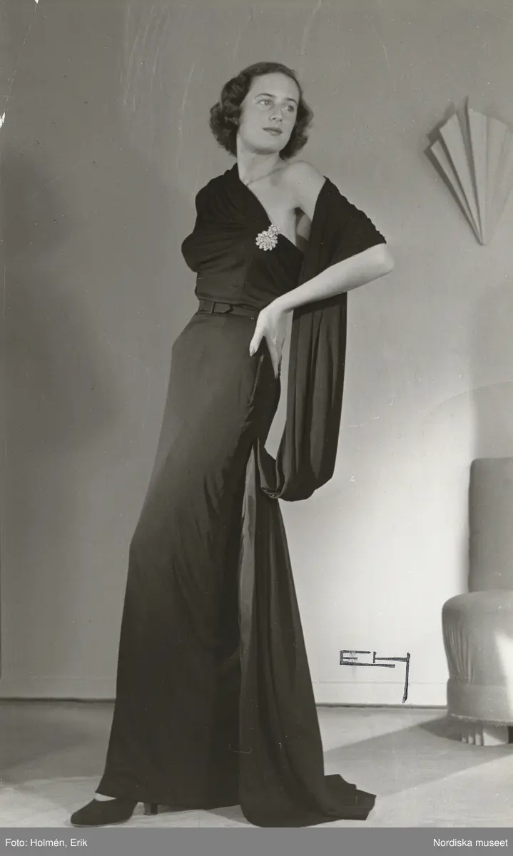 Nordiska Kompaniet. Kvinna i mörk aftonklänning med ena axeln bar. Över bysten en drapering sammanhållen av en rund brosch. text på baksidan: "Hösten -49 N.K. efter Desses"