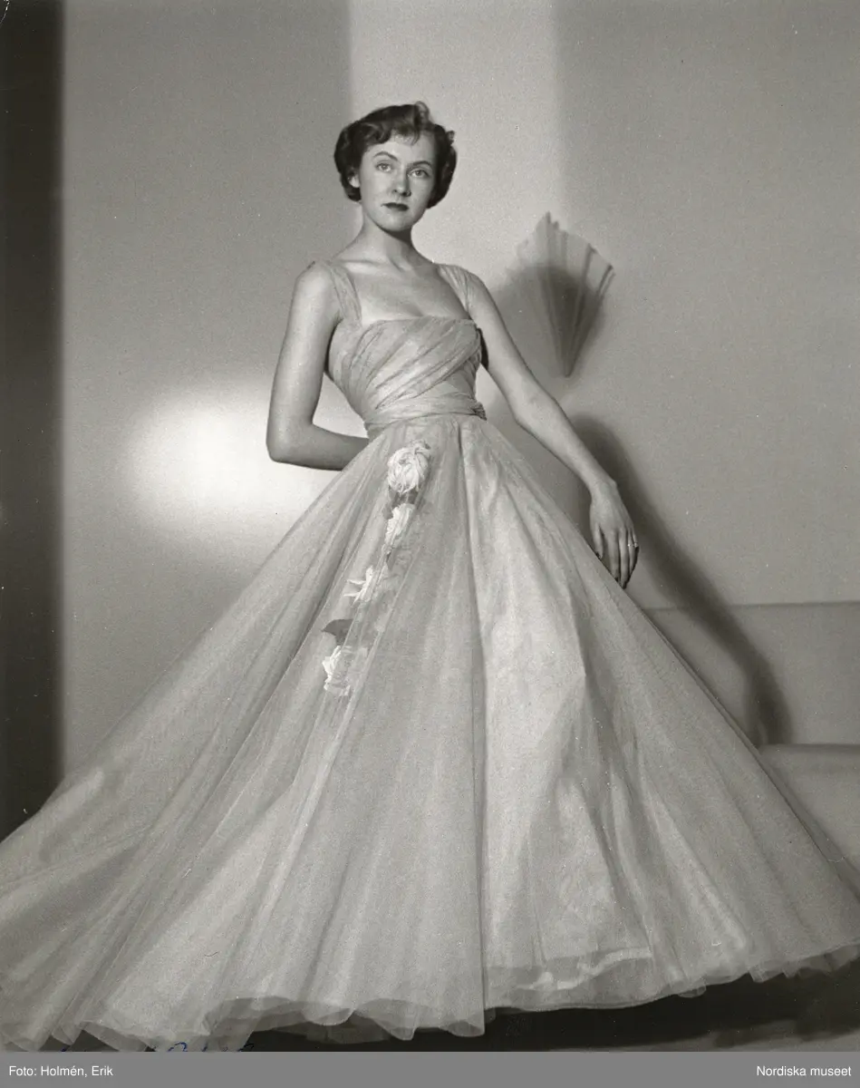 Nordiska Kompaniet. Kvinna i ljus aftonkänning med snävt liv, breda axelband och drapering över bysten. Vid kjol. Från midjan en hängande ranka av tygblommor.Text på baksidan: " J. Griffe. Hösten -49"
