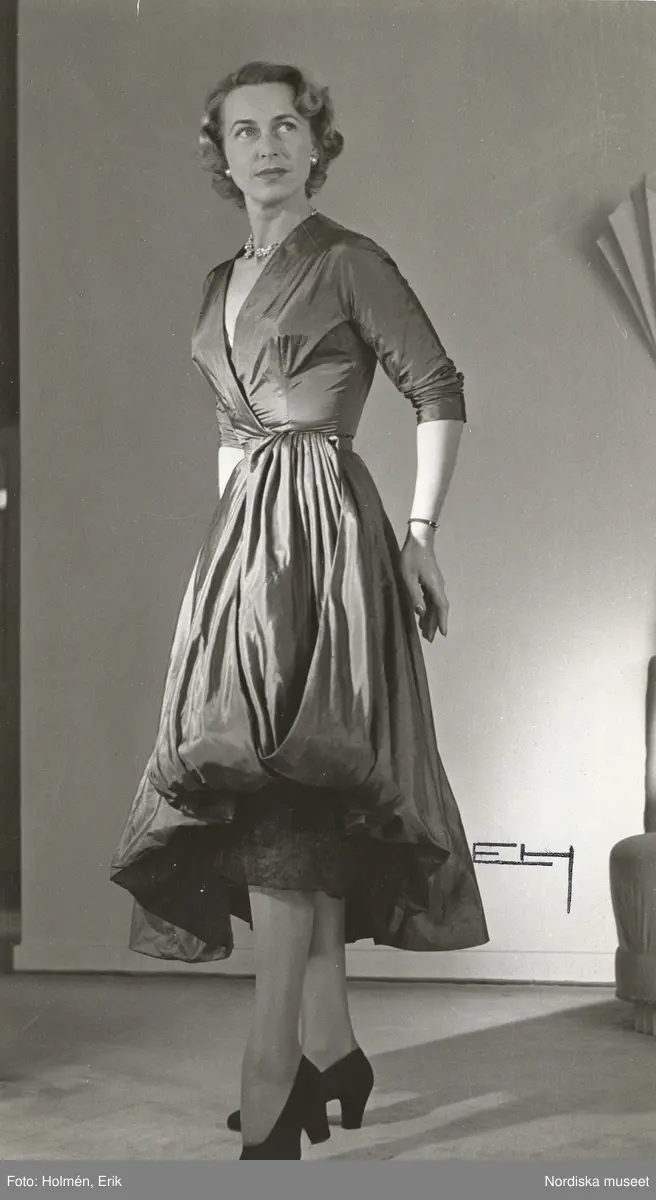 Nordiska Kompaniet. Kvinna i mörk sidenklänning med djup v-ringning och drapering vid fållen. Text på baksidan: "Balenciaga Hösten 1949."