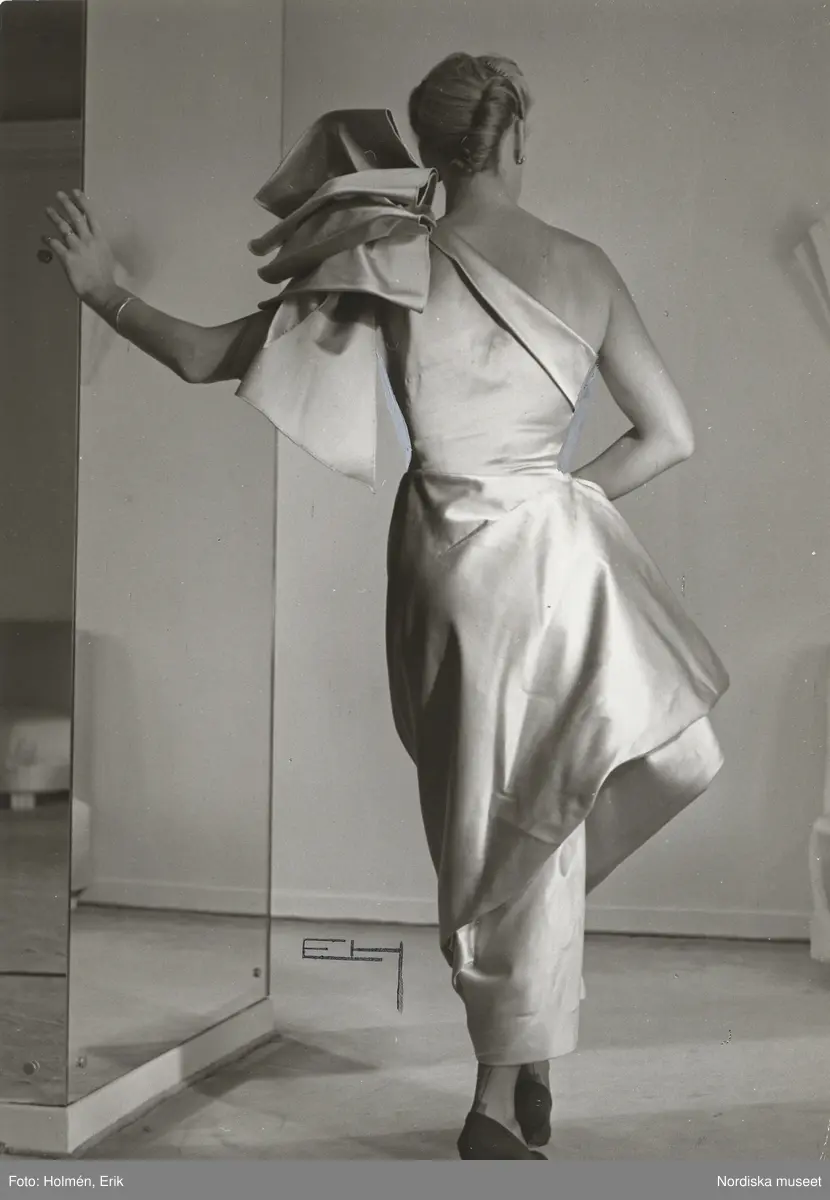Nordiska Kompaniet. Kvinna i ljus sidenklänning med ena axeln bar. Den andra med ett stort arrangemang med rosett. Text på baksidan: "Jaques Griffe Hösten 1949".